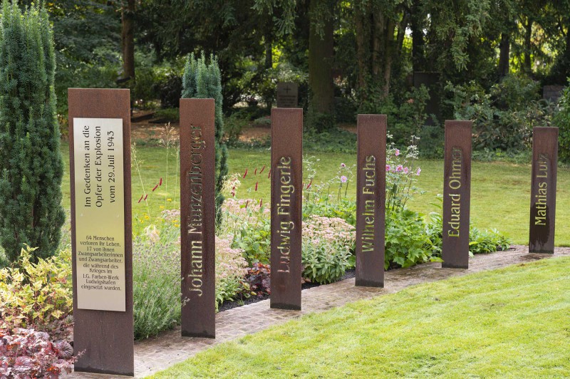 Im Mai 2021 wurde auf dem Gelände der BASF eine „Stolperschwelle“ als Zeichen der Erinnerung an die Unterdrückung Zehntausender Zwangsarbeiter:innen verlegt. Gräber und Mahnmale auf den Friedhöfen verweisen auf diejenigen, die ihre Verschleppung ins Deutsche Reich mit dem Leben bezahlen mussten.