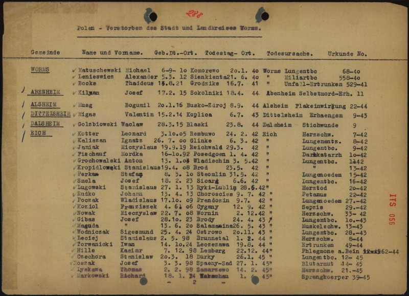 Die mangelhafte Ernährung und unmenschliche Arbeitssituation führten nicht selten zum Tod der Strafgefangenen. Es konnten 23 verstorbene Häftlinge aus Polen nachgewiesen werden. Sie wurden zunächst auf dem Gemeindefriedhof Eich oder in der Eicher Gemarkung bestattet und 1965 umgebettet auf einen Ehrenfriedhof in Bingen Dietersheim.