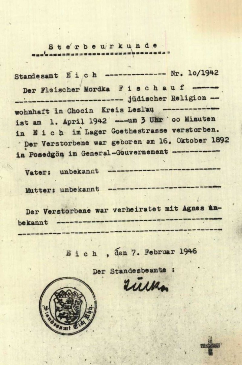 Unter den Häftlingen des „Polenlagers“ befand sich ein jüdischer Pole: Mordka Fischauf. Von Beruf, so wurde es in den Akten des örtlichen Standesamtes erfasst, war er „Fleischer“ aus dem besetzten „Reichsgau Wartheland“ (Großpolen). Geboren wurde er 1892 etwas weiter östlich, in dem Gebiet, das unter deutscher Besatzung Generalgouvernement genannt wurde. Mordka Fischauf wurde wegen des Vorwurfs des „Schwarzschlachtens“ nach Eich deportiert. Er starb dort am 1. April 1942, die angegebene Todesursache lautete „Darmkatarrh“.