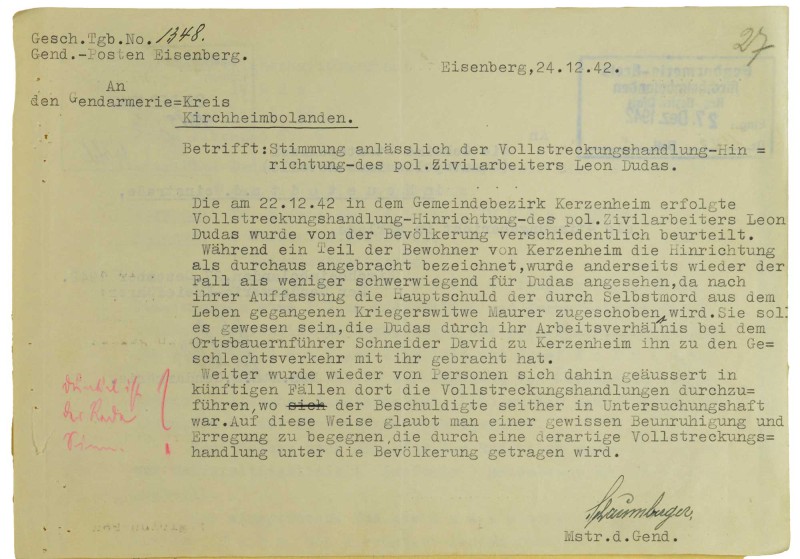 In diesem besonderen Fall blieb das Verbrechen nicht gänzlich ungesühnt: Der Feldhüter Bach, der Brauer und Dudas denunziert hatte, wurde am 11. Mai 1948 vom Tribunal Général der französischen Militärregierung wegen Verbrechens gegen die Menschlichkeit zu zwei Jahren Gefängnis verurteilt. Ein öffentliches Zeichen des Gedenkens existiert bis heute nicht. Michael Wiesheu hat mit seinem 2021 erschienenen „Bericht über die Ermordung des Leon Dudas in Kerzenheim am 22. Dezember 1942“ das Verbrechen in Erinnerung gerufen.