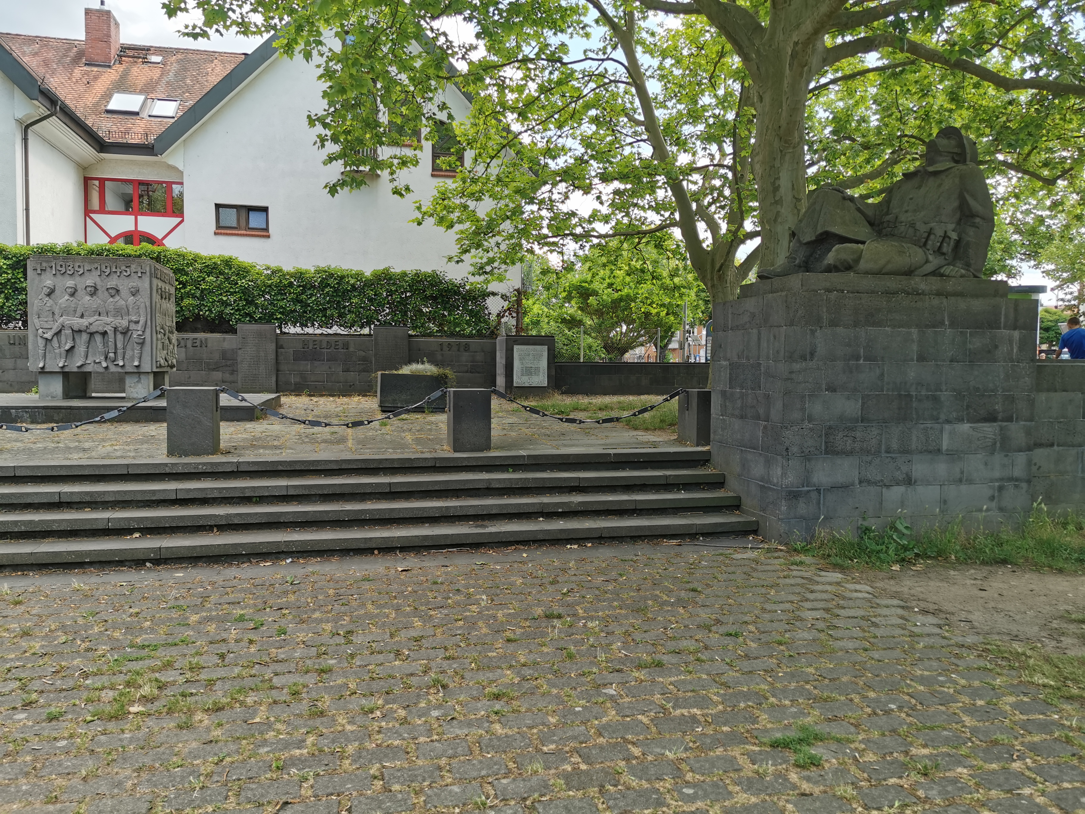 Es handelt sich eigentlich um ein Ehrenmal für Tote des Ersten Weltkriegs, das sich an der Ecke Juxplatz, Breite Straße an zentraler Stelle in Gonsenheim befindet. Errichtet wurde es aber während des Nationalsozialismus 1938. Die martialische und heroische Bildsprache legt davon Zeugnis ab. Ein überlebensgroßer Soldat reckt sich himmelwärts, die ganze Anlage ist wie ein kleiner Ehrenhof gestaltet.
