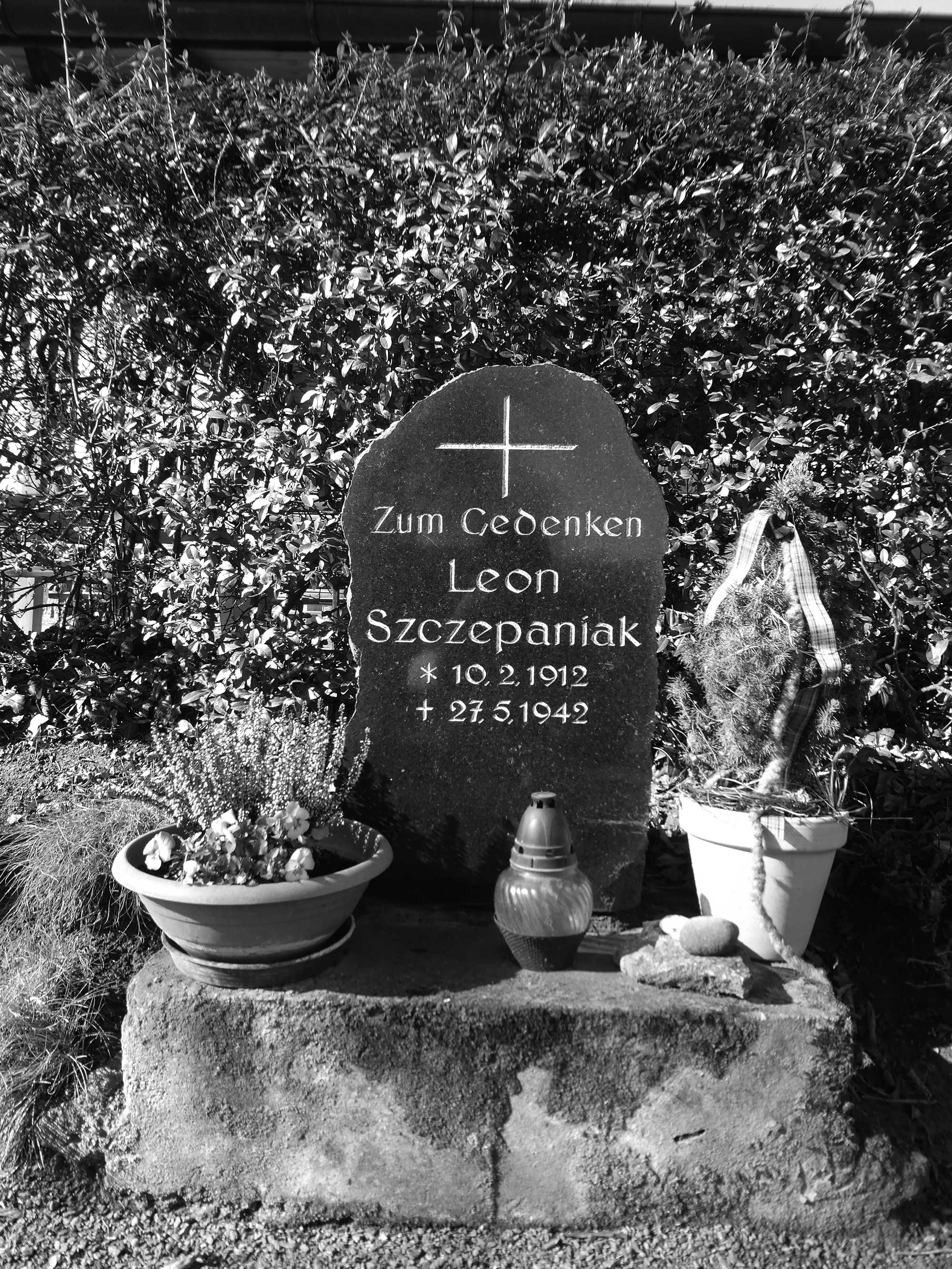 Nach dem deutschen Überfall auf Polen 1939 geriet Leon Szczepaniak als Unteroffizier der polnischen Armee in deutsche Kriegsgefangenschaft. Die Deutschen brachten ihn zur Arbeit in der Landwirtschaft ins rheinhessische Elsheim, wo er Margarete Hess kennenlernte. Im Jahr 1941 erhielt der Bürgermeister eine Anzeige über ein Verhältnis des 29-jährigen Polen und der 22-jährigen Deutschen – und leitete sie nach Wiesbaden weiter. Daraufhin wurde Leon Szczepaniak am 1. September in Sonderhaft genommen. Zugleich nahmen Gestapobeamte Margarete Hess fest und misshandelten sie. Sie wurde zu anderthalb Jahren Gefängnis verurteilt – sie habe „ihr Deutschtum und ihre Frauenwürde vergessen“. Leon Szczepaniaks Antrag auf „Eindeutschung“ lehnten die Behörden ab, und man brachte ihn am 27. Mai 1942 zurück nach Elsheim. Auf dem Gelände des heutigen Sportplatzes wurde er im Beisein der polnischen Zwangsarbeiter:innen aus der Umgebung gehängt. Ein Standesbeamter gab zynischerweise als Todesursache zu Papier: „Genickbruch“. Der Leichnam wurde anonym in Mainz auf dem Hauptfriedhof bestattet.